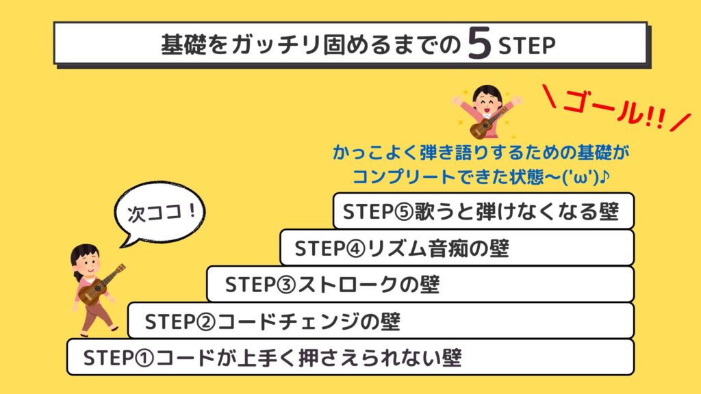 かっこよく弾き語りをするために必要な「基礎」を5つのSTEPに分けて練習できるようになっています(‘ω’)v